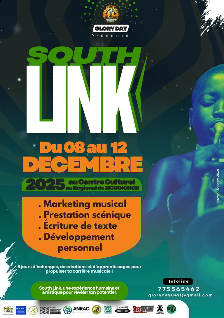 South Link est un programme de résidence artistique de 5 jours initié par Glory Day à Ziguinchor, dédié à la formation et à la mise en lumière des jeunes talents hip-hop du Sud du Sénégal. Le projet réunit 5 artistes émergents encadrés par 4 formateurs experts venus de Dakar, spécialisés en écriture, performance scénique, marketing musical et leadership artistique.